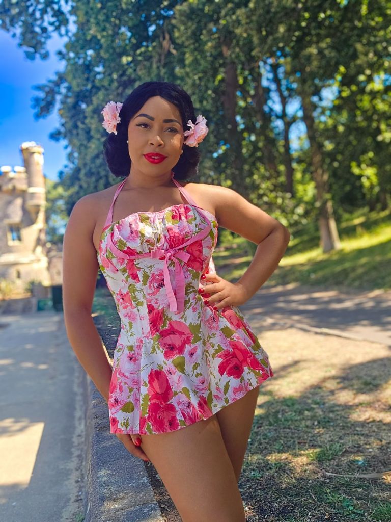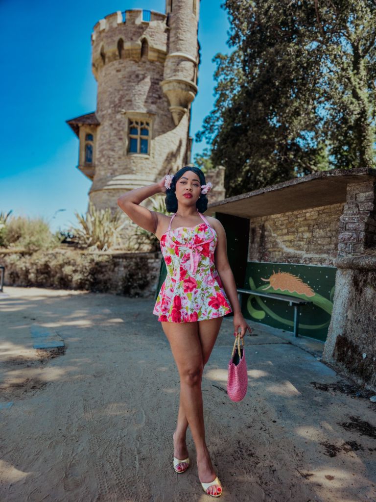 The bathing suit I’m wearing is inspired by the iconic 1950s swim dress — a stylish alternative to bikinis that offered more coverage while celebrating the feminine form. These suits often featured built-in bras, flared skirts, ruched bodices, and halter necklines, like the one I’m wearing from Dig For Vintage.