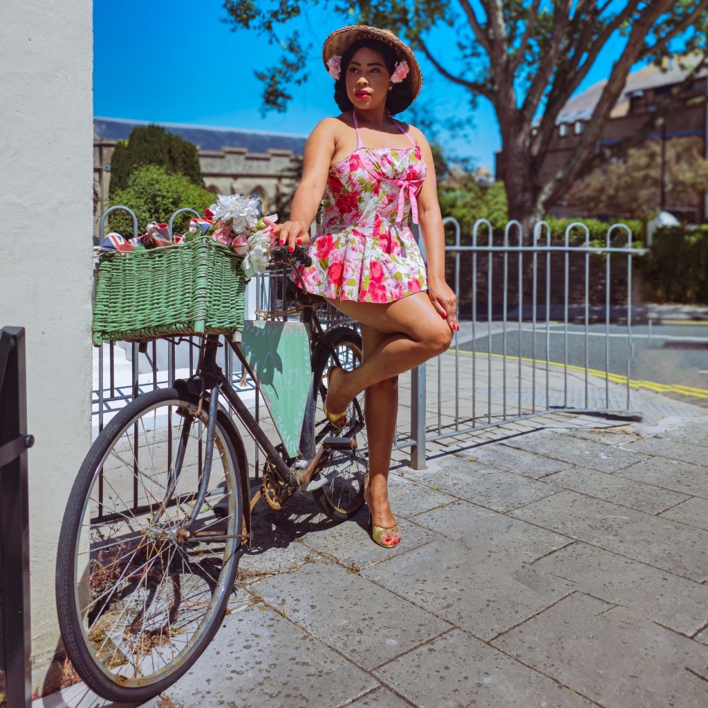 On my way to the beach, I couldn’t resist striking a pose with this beauty. It is a perfect match for a sun-soaked summer day. There’s something so whimsical about vintage bicycles — the rusted charm, woven baskets, and stories they seem to carry. I love how they instantly transport you to a gentler time, where the pace was slower and every ride felt like a little adventure. Styled in my 1950s floral swimsuit from Dig For Vintage,