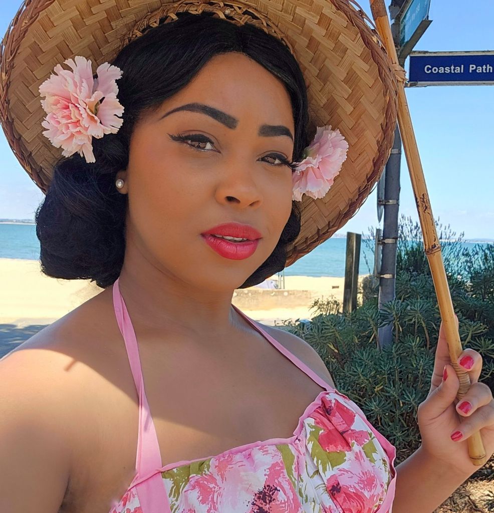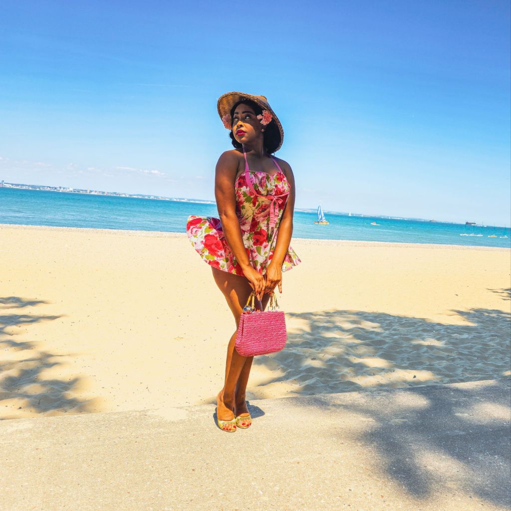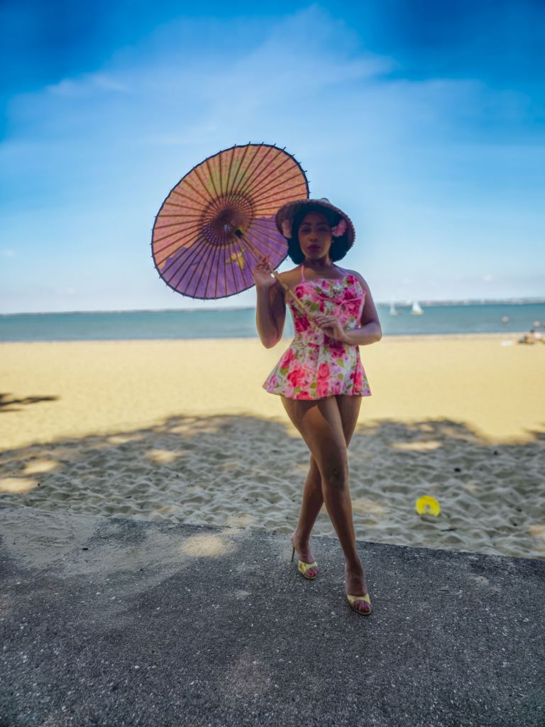 Sunshine, sea breeze, I’m spending the day at Ryde Beach wearing this stunning 1950s floral swimsuit from Dig For Vintage. The vibrant print, peplum silhouette, and halter neckline make it feel like I’ve stepped right out of a pin-up postcard. Styled with classic red lips, a straw hat, and my favourite parasol — it’s all about timeless seaside elegance.